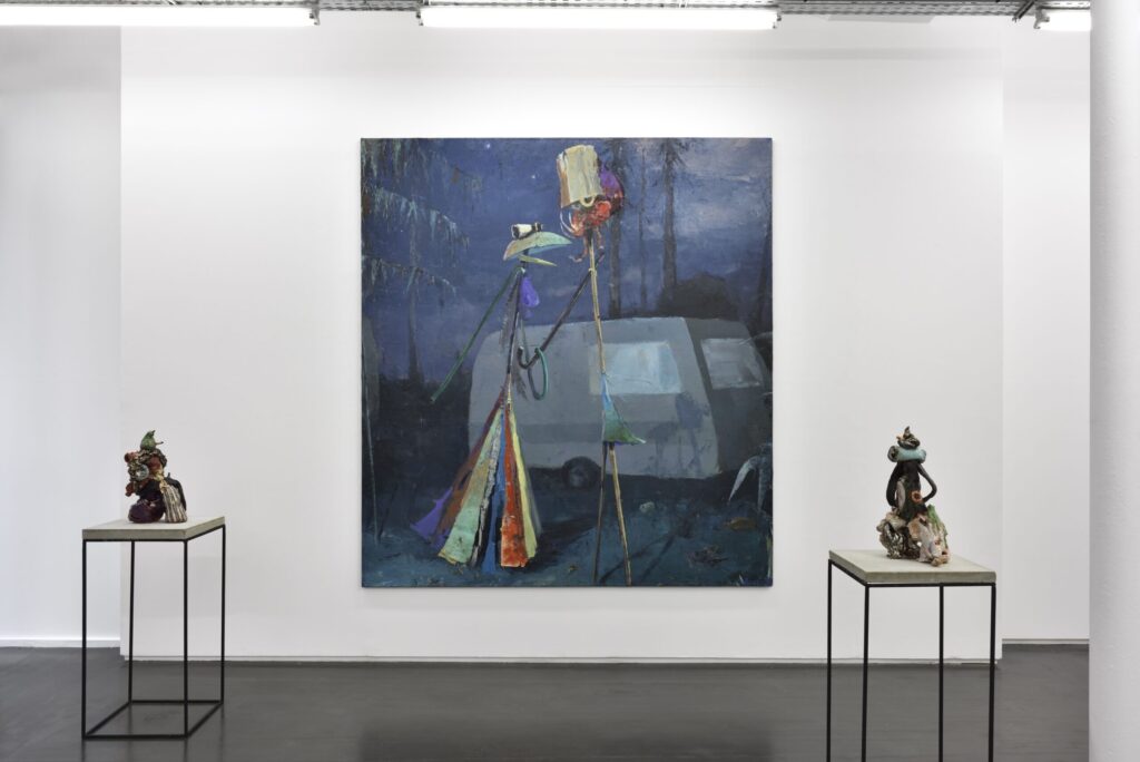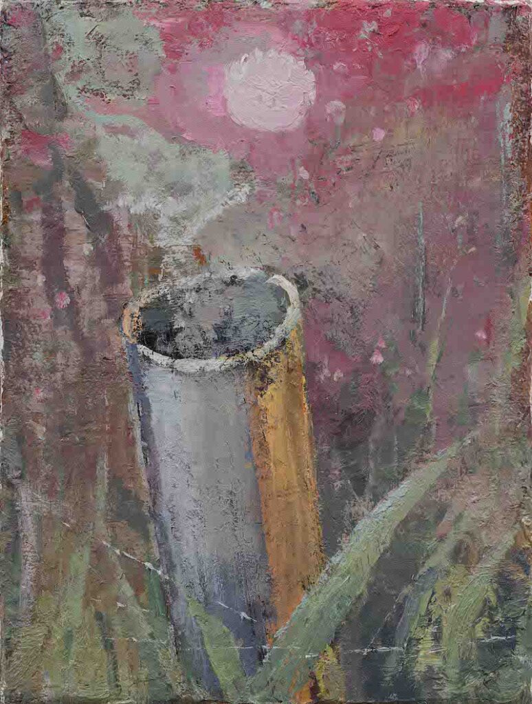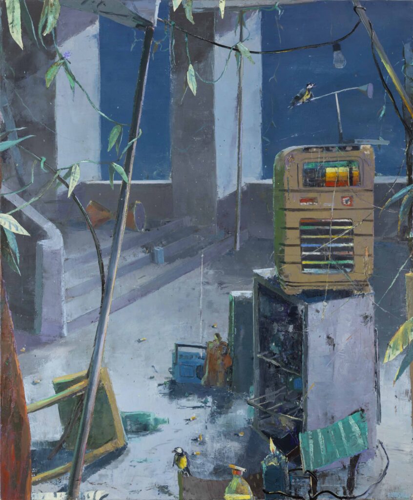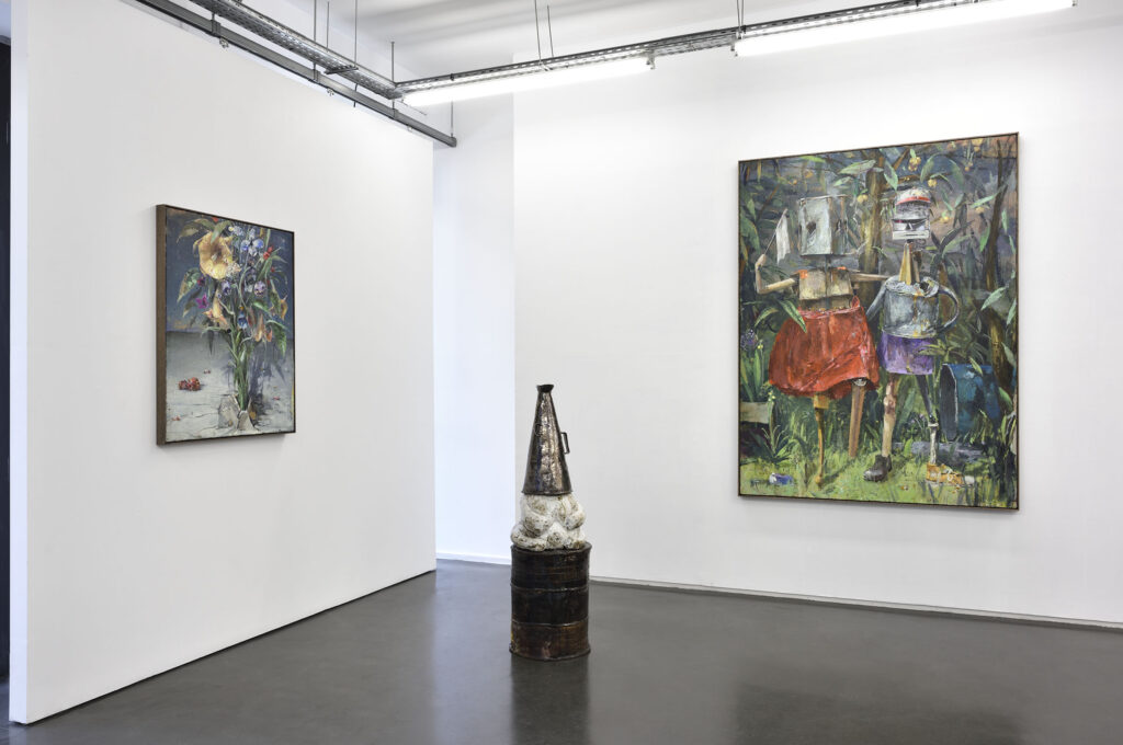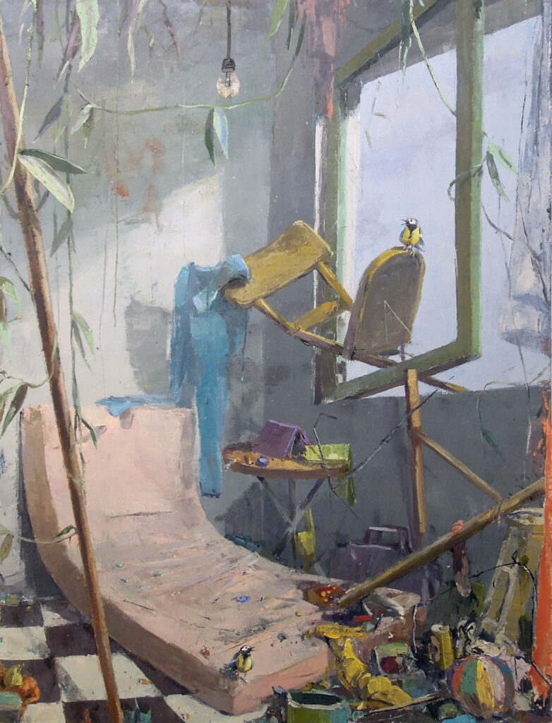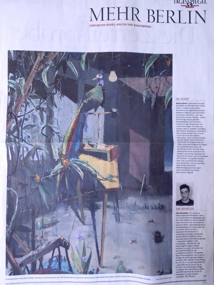 Fritz Bornstück peint des natures mortes : des agencements d’objets précaires, à l’intérieur d’une pièce baignant dans une lumière irréelle ou dans un paysage dénudé. On a du mal à assimiler de tels agencements à ce qu’on sait de la nature morte : ces compositions d’artefacts magnifiés, luisants, attirants. Ici, nous sommes en présence d’objets sans séduction, des bouts d’objets, des débris, des détritus. Ce sont ces tas laissés sur le trottoir après un déménagement, les traces d’un campement, de fortune dans la nature, ou encore ce qu’il reste d’une vie dans une maison abandonnée. Les références cachées de l’histoire de l’art se superposent aux motifs empruntés au réel. La peinture crée ainsi sa réalité propre dont la matière souvent épaisse, est elle-même une composante à part entière.