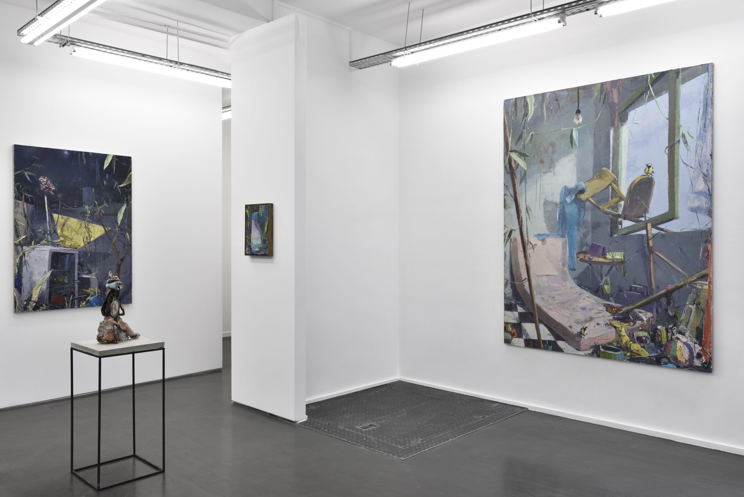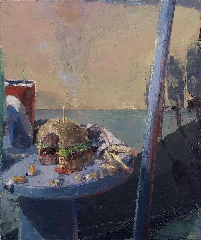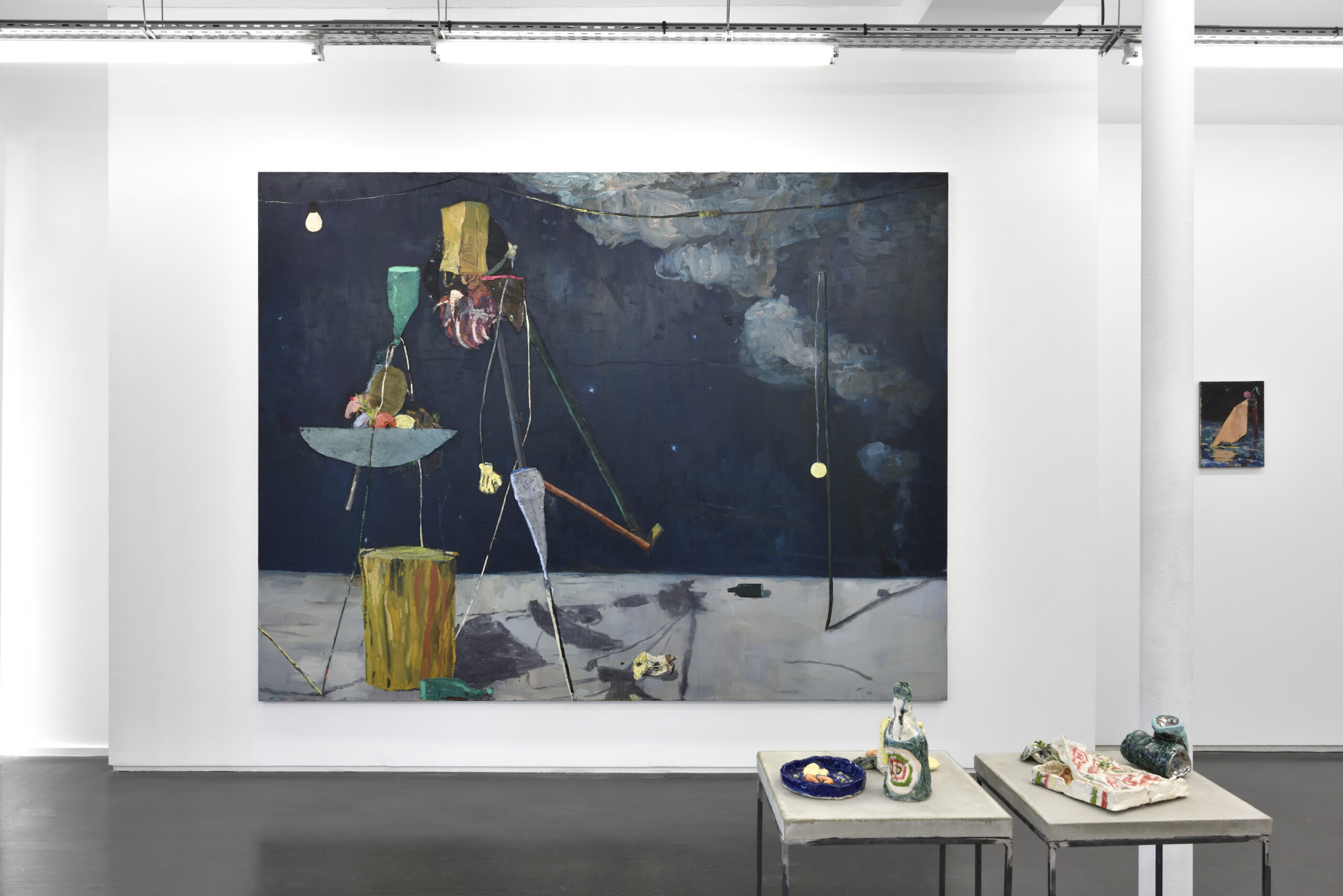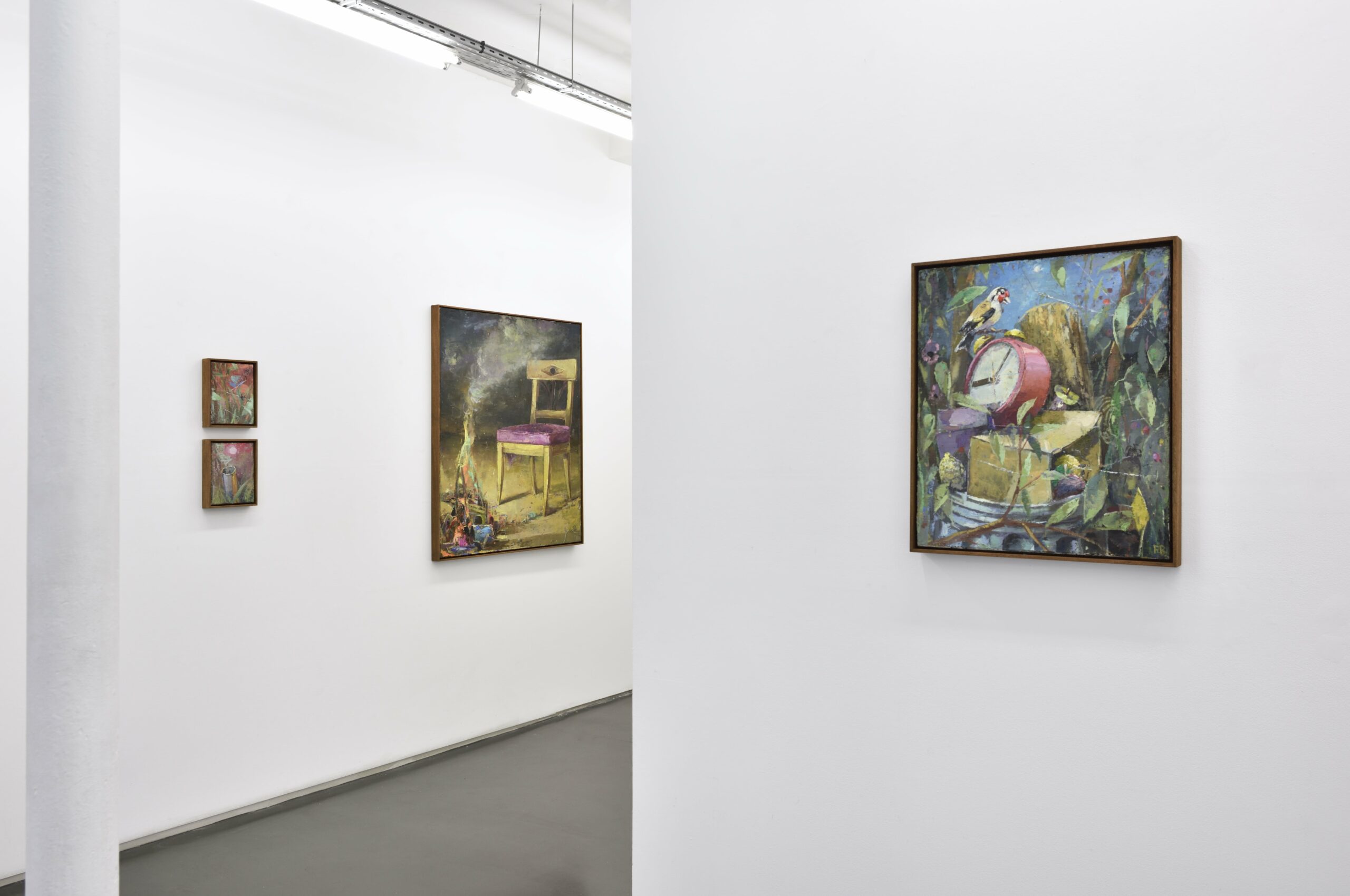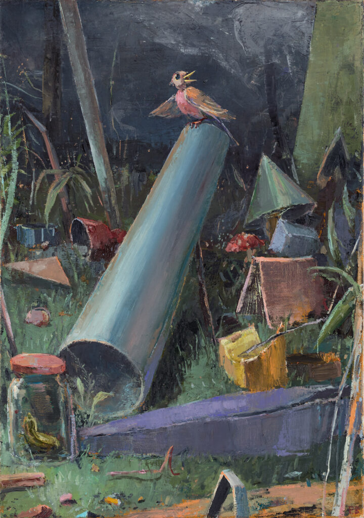 Fritz Bornstück peint des natures mortes : des agencements d’objets précaires, à l’intérieur d’une pièce baignant dans une lumière irréelle ou dans un paysage dénudé. On a du mal à assimiler de tels agencements à ce qu’on sait de la nature morte : ces compositions d’artefacts magnifiés, luisants, attirants. Ici, nous sommes en présence d’objets sans séduction, des bouts d’objets, des débris, des détritus. Ce sont ces tas laissés sur le trottoir après un déménagement, les traces d’un campement, de fortune dans la nature, ou encore ce qu’il reste d’une vie dans une maison abandonnée. Les références cachées de l’histoire de l’art se superposent aux motifs empruntés au réel. La peinture crée ainsi sa réalité propre dont la matière souvent épaisse, est elle-même une composante à part entière.