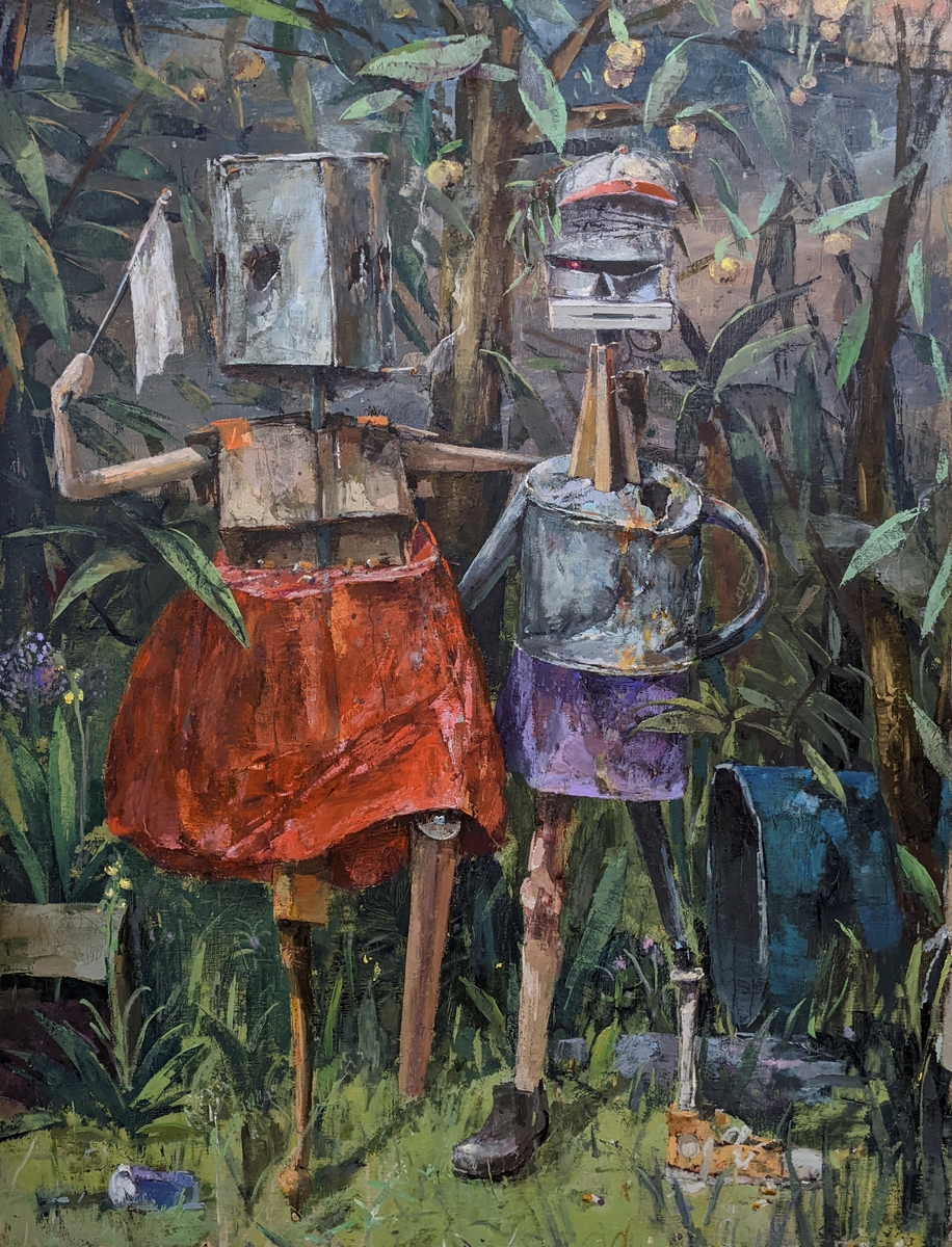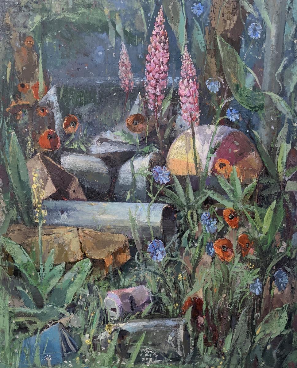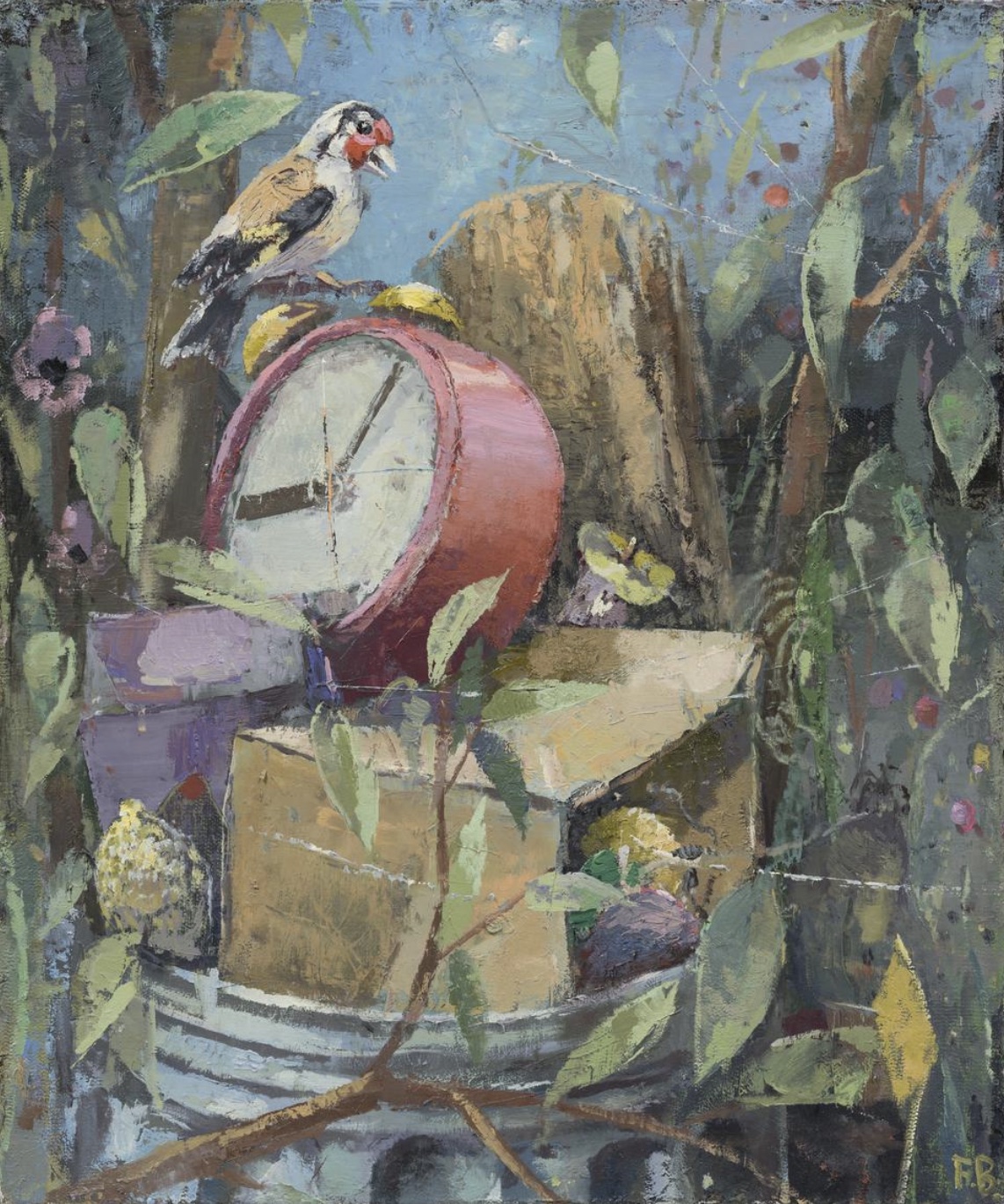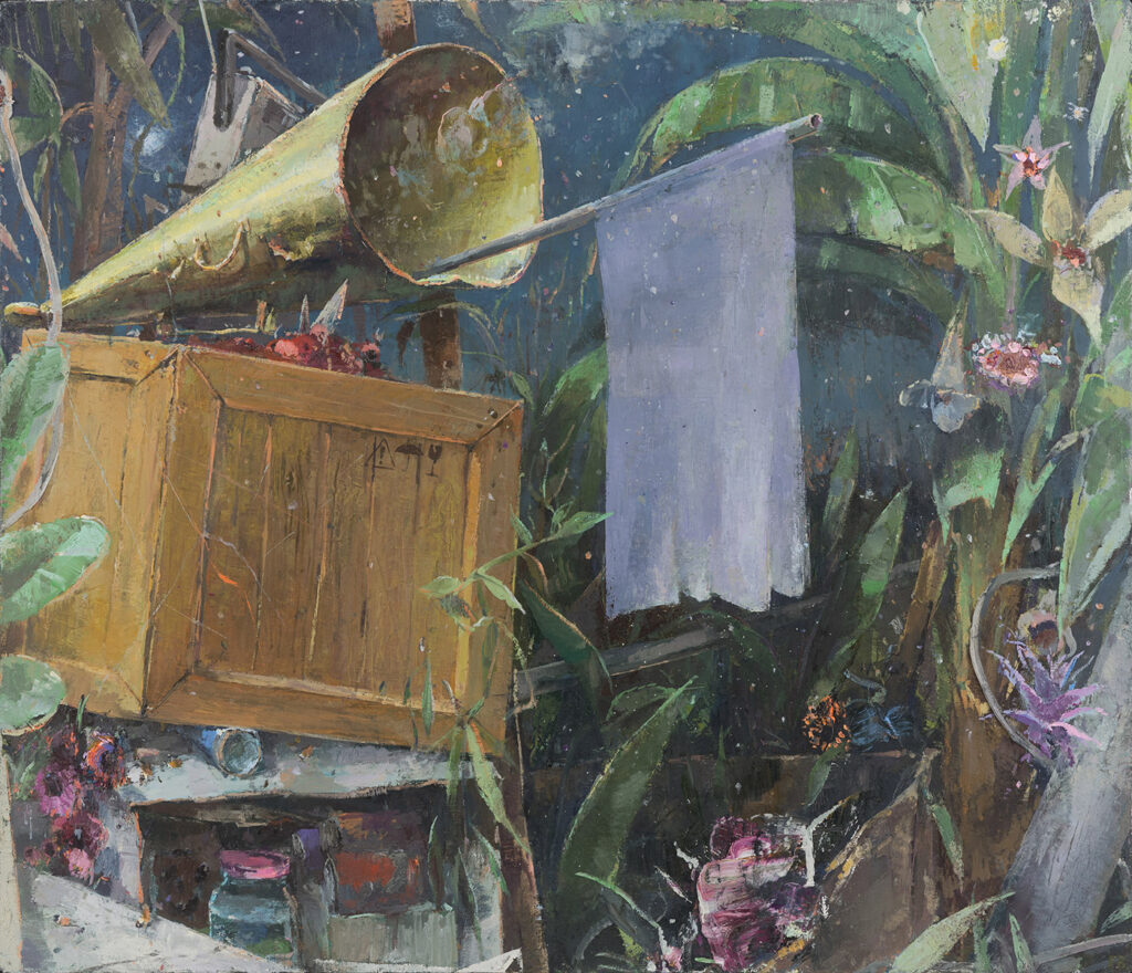 Fritz Bornstück peint des natures mortes : des agencements d’objets précaires, à l’intérieur d’une pièce baignant dans une lumière irréelle ou dans un paysage dénudé. On a du mal à assimiler de tels agencements à ce qu’on sait de la nature morte : ces compositions d’artefacts magnifiés, luisants, attirants. Ici, nous sommes en présence d’objets sans séduction, des bouts d’objets, des débris, des détritus. Ce sont ces tas laissés sur le trottoir après un déménagement, les traces d’un campement, de fortune dans la nature, ou encore ce qu’il reste d’une vie dans une maison abandonnée. Les références cachées de l’histoire de l’art se superposent aux motifs empruntés au réel. La peinture crée ainsi sa réalité propre dont la matière souvent épaisse, est elle-même une composante à part entière.